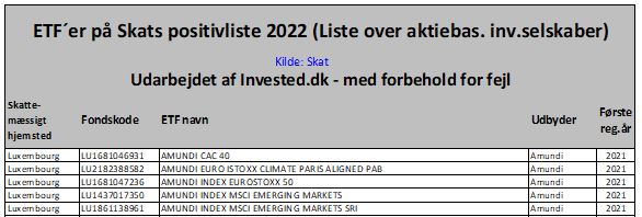 De omfattede indeksfonde på Skats positivliste for 2024Dominerende på Skats positivliste er især verdens største ETF udbyder, Blackrocks iShares, hvis aktierelaterede produktudbud altså udgør en god andel af ETF´erne på listen. De store udbydere Lyxor (nu fusioneret med Amundi) og Xtrackers har også mange ETF´er på listen. I forhold til Xtrackers skal man være opmærksom på, at det ikke er alle aktiebaserede fonde, som Xtrackers udbyder, der er at finde på listen. Vil man investere i ETF´er fra Xtrackers bør man derfor tjekke listen grundigt, hvis man vil sikre sig en bestemt beskatningsform.