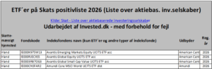 Invested.dk har som tidligere år bearbejdet Skats positivliste for 2026 og trukket de ca. 900 relevante indeksfonde ud i en selvstændig excel fil. Det giver et noget bedre overblik, hvis man alene er på udkig efter egnede indeksfonde: ETF positivliste aktieindkomst 2026. Brug af listen er på eget ansvar og er med forbehold for fejl. Listen er sorteret alfabetisk efter udbyder og navnet på de enkelte ETF´er. Man kan endvidere sortere listen efter geografisk hjemsted, fondskode eller efter hvornår ETF´en er kommet på listen.