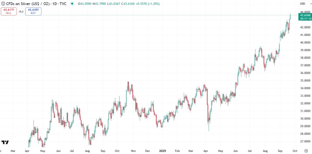 Guld er i år steget omkring 30 procent i år og handles nu på rekordniveau omkring 3.700 dollar. Sølv har ligeledes sat nye højder og ligger aktuelt i 44,10 dollar – et niveau, der sidst blev set i 2011. Næste tekniske modstandsniveau vurderes at være 48,70 dollar pr. ounce, hvilket ikke er nået siden 1980.