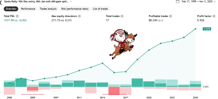 Det såkaldte Santa Claus Rally har i mange år ført til stigende aktiekurser generelt hen over julen. Her er det en graf (herunder), der viste afkastet i det store S&P500 aktieindeks, hvis man havde købt den 14. handelsdag i december og solgt igen den 10. handelsdag i januar i de år, hvor prisen er over et glidende gennemsnit på 200 (daily).