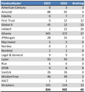 Nedenstående tabel viser i oversigtsform de forskellige udbydere samt antal ETF´er fra hhv. 2025 og 2026: